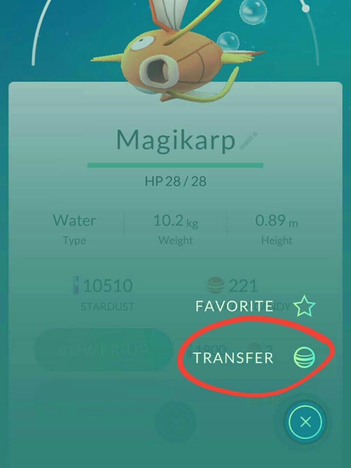 平常收服“精灵”的过程中,你也能够累积星尘(stardust)和糖果(candy),累积足够后就能让“精灵”进化,同样能累积500点数的经验。如果你捉到很多只相同的低等级“精灵”,你也可以点击“精灵”档案右下方的标志,将“精灵”转调(transfer)出去,兑换糖果。